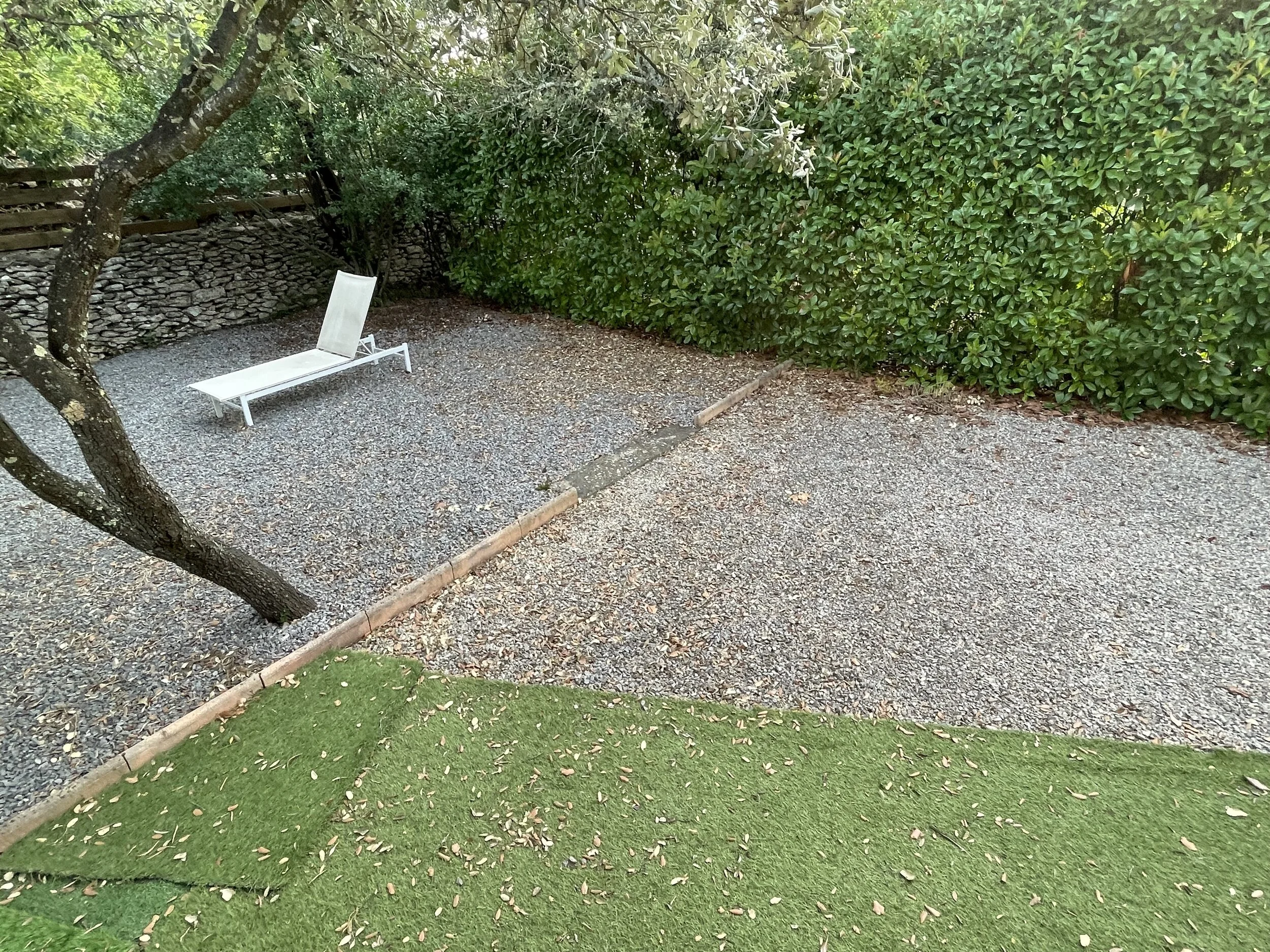 The cottage with terrace is 112sqm (1205 sqft) fully equipped with 2 king size beds, an open living room area with kitchen, 2 bar stools, a round kitchen table with 4 chairs, two couches, coffee table and TV with French channels and a smart TV to log into your apps such as, Netflix or Amazon to watch your favorite movies or TV programs. WIFI is available throughout the cottage and garden. The cottage has a shower and toilet (not a bathtub), a laundry room with washer and a dryer and outside clothesline. Outside the large bedroom is a covered terrace with table and 4 chairs which overlooks the garden with 4 Adirondack chairs and two lounge chairs for hanging out in the shade under trees. Walking out into the garden you step into an area of faux grass followed by a pebbled garden and beautiful trees for shade (see photos). We also have Air conditioning and mosquito screens for your comfort. Watch Video of the Cottage at Cottage Domaine de Saxe-Roux video